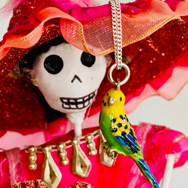 This gregarious parakeet affectionately nicknamed the 'budgie' is most known for their intelligence, sociability and characteristic cheerfulness. Intricately painted by hand with the tiniest of brushes, this brightly coloured enamel pendant is sure to lift your spirits on the dreariest of winter days. It comes complete with our special chunky Sterling Silver jump ring which is usually big enough to slide on and off a chain.