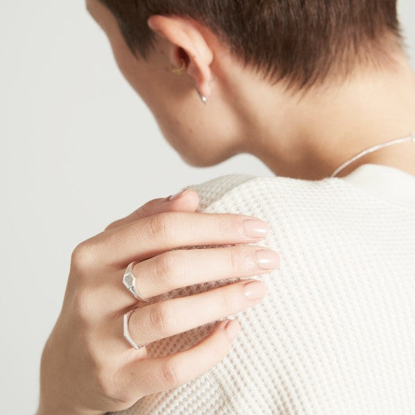 This silver ring explores the structures of the hive and the powerful hexagon shape. The outer edges of the band alternate between flat and chevron edges while the inside is curved for a comfortable fit.