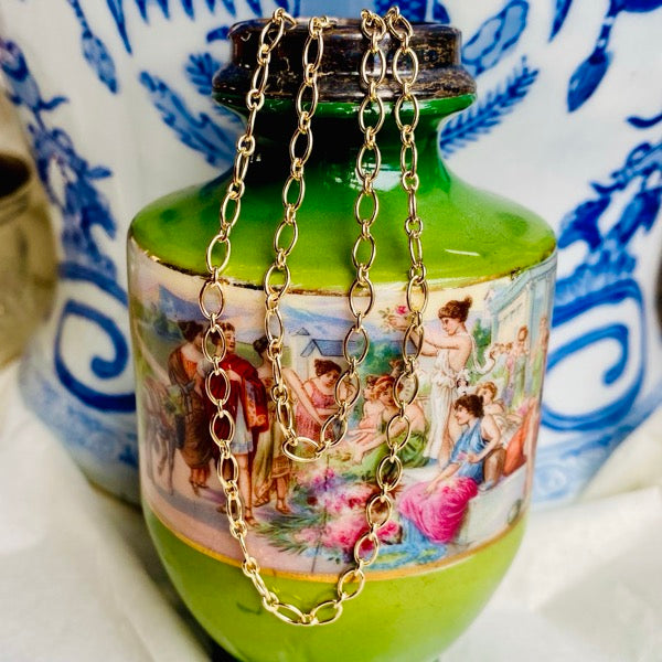 The oval links really stand out, but the chain is light and airy. It looks great as a statement piece, but also makes a useful, interesting chain for a favourite pendant or locket. This chain can also be used to carry a charm collection, spacing the charms along the links. The necklace is 18", but can be fastened on any link to make a choker