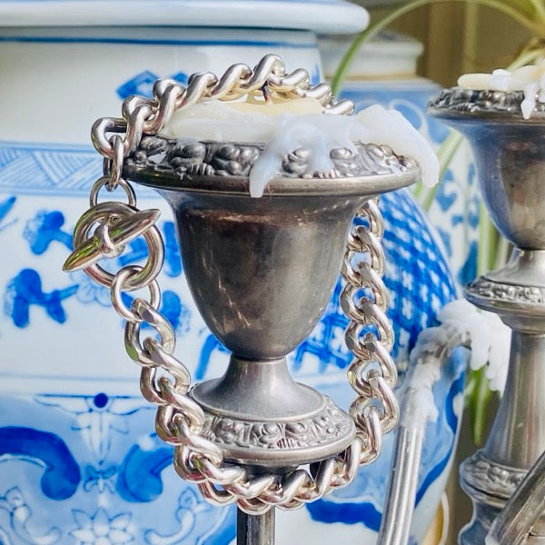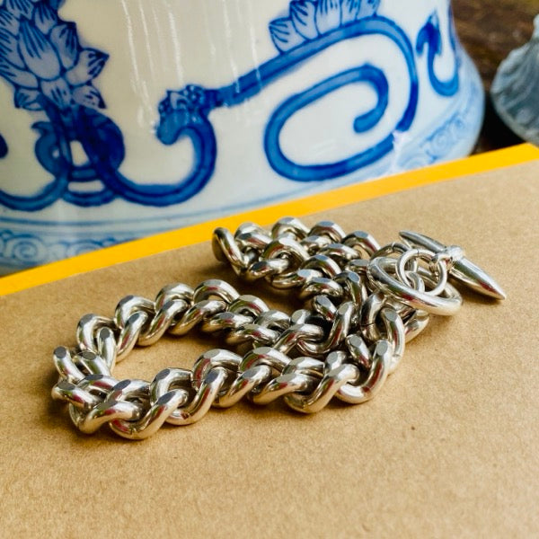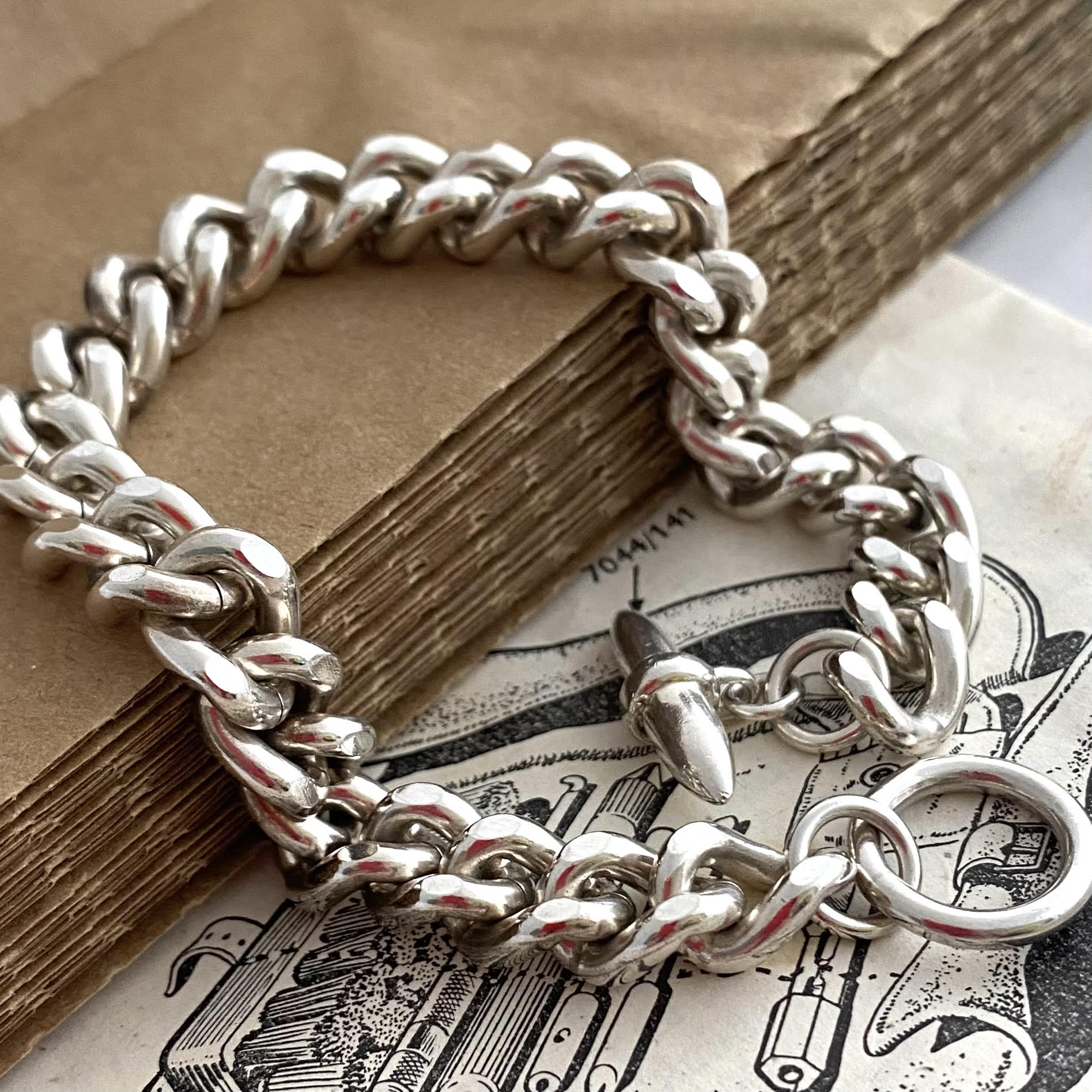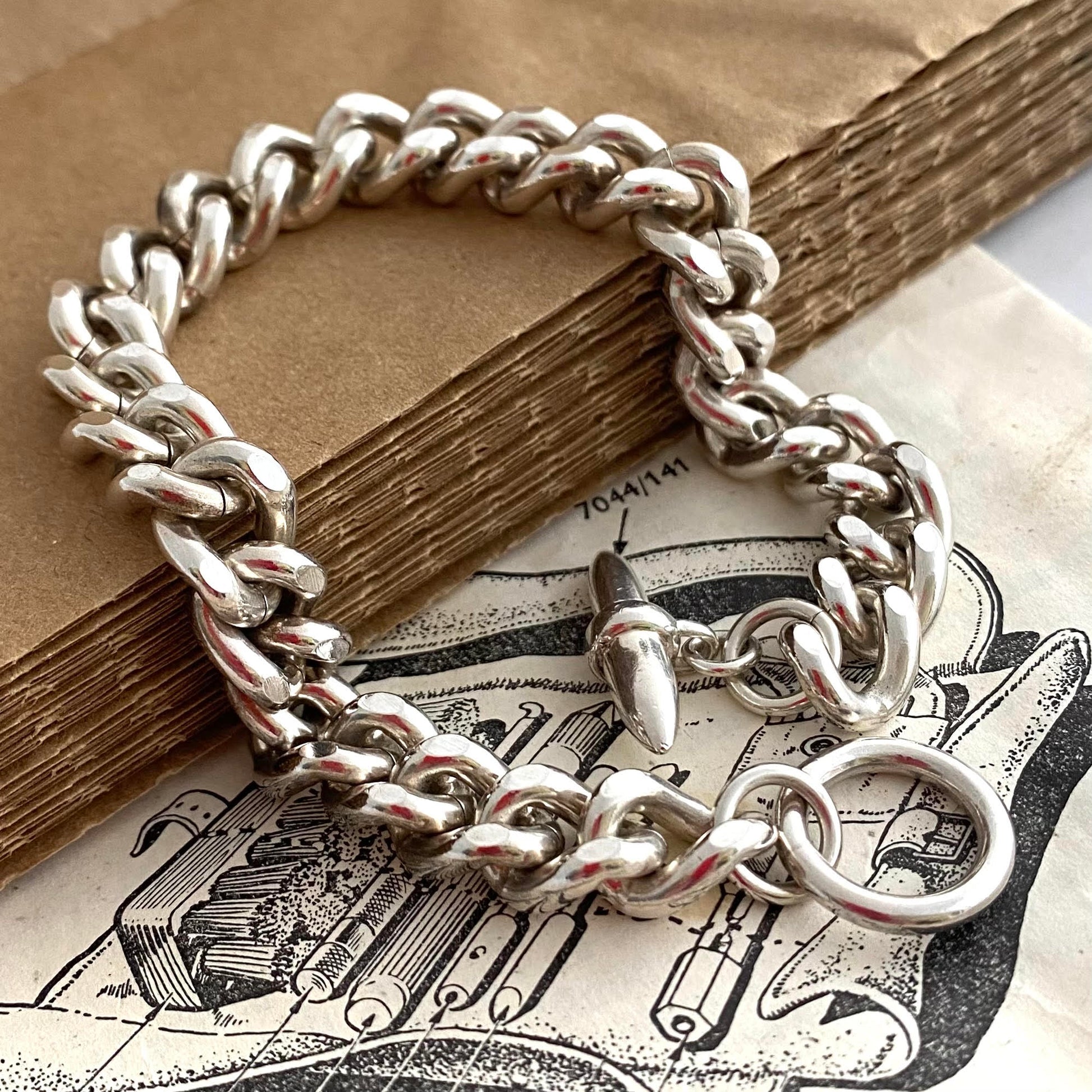 A classic biker style heavy accessory. The substantial rounded links feel comfortable and weighty. The bracelet fastens securely with my signature torpedo t-bar and ring lock. This is great men's bracelet, but can be shortened to any length for a smaller wrist.