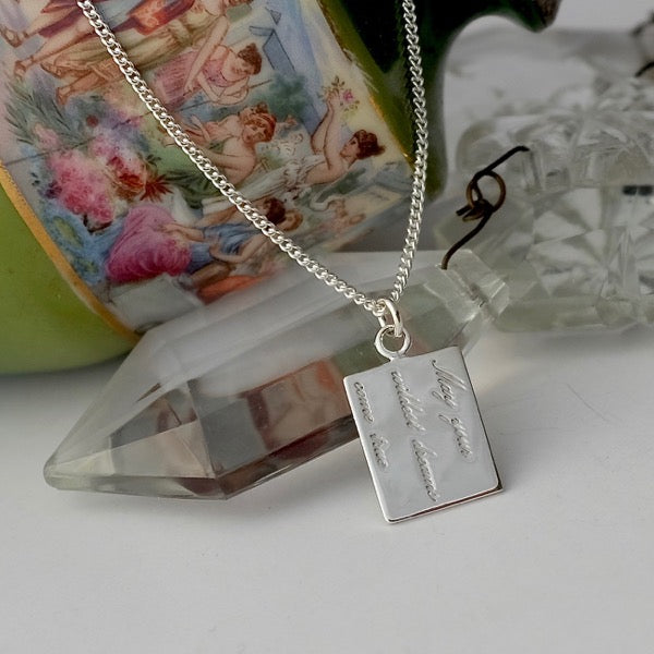 This light, silver tag bears the engraved message "May Your Wildest Dreams Come True" and hangs from light curb chain. The Wildest Dreams Necklace is a lovely gift to give to someone special who is beginning a new phase in their life, whether it is starting a new job, leaving school, or embarking on a big adventure!